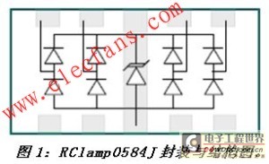 RClamp0584J是這種集成式TVS保護器件的一個最佳實例(圖1)。該器件是RailClamp系列高速接口保護產品的最新成員。這種四線、5V工作電壓保護器件的性能超出了IEC 6100-4-2 level 4對靜電瞬變的保護要求。圖1同時也明確顯示,這款器件采用了獨特的封裝設計。“穿通型(Flow through)”封裝一詞來自升特公司,這種封裝允許走線直接穿過保護器件,因此最大限度地減小了由于平衡差分線對的中斷或失配所導致的額外寄生電感與電容。