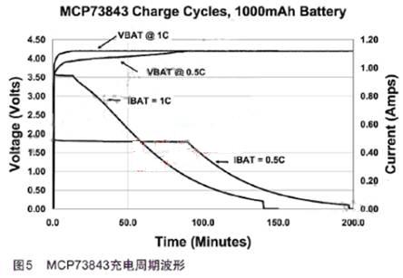 利用MCP73843在1C和0.5C恒流充電速率下的整個充電周期如圖5.以0.5C而不是1C速率充電時,充電結束的時間大約晚了一個小時。充電終止電流從0.07C降到0.035C,使得最終電池容量從~98%增長到~100%.系統設計師必須在充電時間、功率損耗和可用電池容量之間進行權衡。