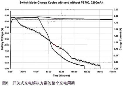 利用開關式充電解決方案的整個充電周期如圖6所示。通過在充電系統中采用電池監控器,可以大大縮短充電周期,使用電池監控器就不必再檢測電池包保護電路兩端的電壓以及充電電流的接觸電阻。
