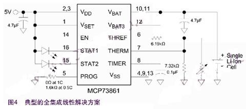 基于Microchip MCP73861的全集成線性解決方案如圖4所示。MCP73861包含了MCP73843的所有功能,另外還包括電流檢測、傳輸晶體管、反向放電保護以及電池溫度監測。