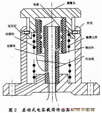 差動式電容載荷傳感器結構示意圖如圖2所示。它主要由測量頭、外殼、敏感元件(彈性體)、定極柱、動極柱、電極、等位環(huán)、引出線等構成。其特點為:測量范圍寬;靈敏度高,便于拾取信號;極板間不接觸、不變形、不磨損,機械損失小、壽命長;電容傳感器受溫度影響小;動態(tài)性能好;結構簡單、適應各種惡劣環(huán)境和場合。