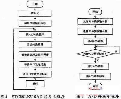 數據的采集與處理單元采用自帶A/D轉換器的STC89LE516AD單片機芯片,完成數據采集、模數轉換、數據處理以及驅動顯示單元。當時鐘在40 MHz以下時,每17個機器周期可完成一次A/D轉換。STC89LE516AD單片機與差動脈沖寬度調制集成電路結合起來,完成電容傳感器的檢測。其主程序和A/D轉換程序流程圖如圖4,圖5所示。