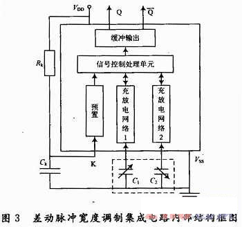 差動式電容載荷傳感器是將被測載荷的變化轉換為電容量的變化輸出,而電容傳感器所產生的電容量很微小,電容極板引線與地之間產生的雜散電容往往大于被測電容。因此小電容轉換測量技術一直被人們所重視。然而,一般的檢測電路結構比較復雜,精確度較低,不能滿足測量要求。為了提高測量的靈敏度,針對差動式電容載荷傳感器,在基于四相檢測技術的電荷轉移式電容檢測電路的基礎上,設計采用了差動脈沖寬度調制集成測量電路,該電路具有集成度高、實現了電容傳感器頭有源化、輸出脈沖方波、省去高頻激勵信號源、功耗低、抗干擾能力強、分辨率高等特點,尤其適合差動式電容傳感器的測量。其內部結構框圖如圖3所示,圖中的虛線框內為差動式電容傳感器的兩個可變電容C1和C2。