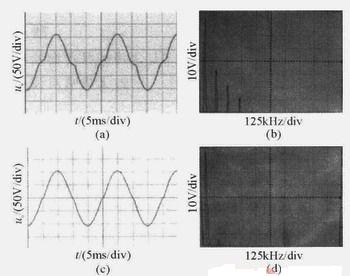 在實驗中,開關(guān)頻率為10kHz,正弦波頻率為50Hz,取L1=1.15mH,L2=0.1mH,C=90μF,負載為純阻性,滿載時為8歐姆,死區(qū)時間Td設(shè)置為2μs。