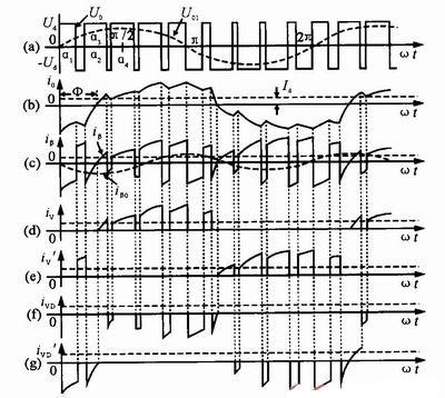 通過比較可知,因為續(xù)流的緣故,死區(qū)時間內(nèi)A、B點的電位不再為零。當i>0時,VD2、VD3續(xù)流形成回路,A端電位UA為-Ed/2,B端電位UB為+Ed/2;當i<0時,VD1、VD4續(xù)流形成回路,A端電位UA為+Ed/2,B端電位UB為-Ed/2。