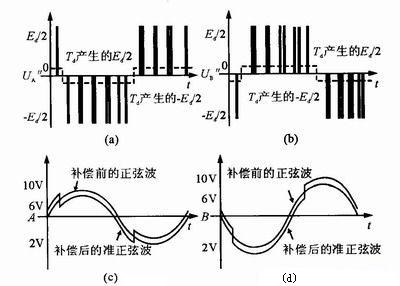 在死區(qū)時間內(nèi),由于續(xù)流的緣故輸出電壓波形發(fā)生了畸變,通過對波形進行等效的補償可以得到準正弦波。推理和實驗均證明該方法能較好地對逆變器橋路輸出電壓進行補償。該方法簡單實用,易于實現(xiàn),具有一定的工程使用價值。