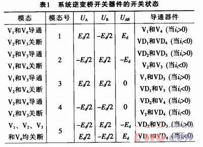 在采用IGBT作為開關(guān)器件的單相橋式PWM逆變電路中,假設(shè)負載為阻感負載。工作時V1和V2的通斷狀態(tài)互補,V3和V4的通斷狀態(tài)也互補。逆變橋的主回路由左右橋臂組成,每個橋臂有兩個IGBT,每一個開關(guān)器件都有一個PWM波控制其導(dǎo)通,且同一橋臂上的兩功率開關(guān)器件不能同時導(dǎo)通,否則會導(dǎo)致直流電壓短路。考慮到在感性負載下二極管VD1、VD2、VD3、VD4存在著續(xù)流的現(xiàn)象,且逆變橋同一橋臂上的兩個IGBT不能同時導(dǎo)通,所以在逆變電路中存在著五種開關(guān)狀態(tài),具體情況如表1所示。單相橋式刪逆變電路如圖1所示。