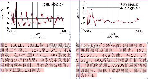 LTC6909上的擴(kuò)展頻譜頻率調(diào)制通過(guò)連續(xù)改變μModule的時(shí)鐘頻率,強(qiáng)制輻射能量分散開(kāi)以改善EMI,防止該能量停留在任何接收器頻帶內(nèi)。μModule開(kāi)關(guān)輻射的紋波是產(chǎn)生不需要的頻譜諧波的罪魁禍?zhǔn)住TC6909擴(kuò)展頻譜頻率調(diào)制功能通過(guò)一個(gè)偽隨機(jī)噪聲信號(hào),將能量擴(kuò)展到一個(gè)寬的頻帶上,從而降低峰值電磁輻射,以降低諧波幅度。