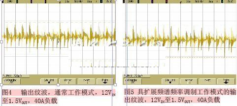 令人驚奇的是,對(duì)該系統(tǒng)進(jìn)一步的分析表明,在使用擴(kuò)展頻譜頻率調(diào)制時(shí),輸出紋波沒(méi)有受到非常大的影響。有和沒(méi)有擴(kuò)展頻譜頻率調(diào)制的性能比較如圖4和圖5所示。比較兩圖中的峰峰值,觀察到的變化是很小的。如果仍不信服,可進(jìn)行另一個(gè)測(cè)試-負(fù)載瞬態(tài)響應(yīng)測(cè)試,以進(jìn)一步確證。