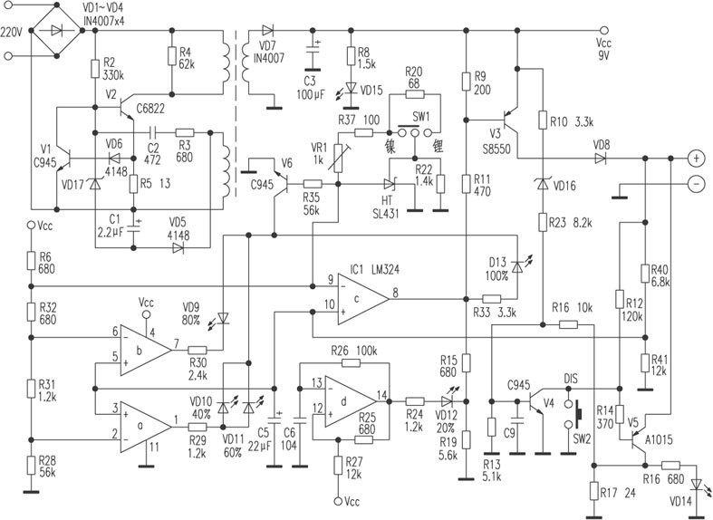 如果是為鎳鎘、鎳氫電池充電,由于這類電池存在一定的記憶效應,需不定時對其進行放電。SW1是鎳鎘、鎳氫、鋰離子電池充電轉換開關。SW1與精密基準電源SL431為運放LM324 ⑨提供兩個不同的精密基準源,由SW1切換。在給鎳鎘、鎳氫電池充電時,LM324 ⑨腳的基準電壓約0.09V(空載);在給鋰離子電池充電時,LM324 ⑨腳的基準電壓約為0.08V(空載),這種設計是由這兩種類型電池特有的化學特性決定的。按下SW2,V5基極瞬間得一低電平而導通,可充電池上的殘余電壓通過V5的e c極在R17上放電,同時放電指示燈VD14點亮。在按下SW2后會隨即釋放,這時可充電池上的殘余電壓通過R16、R13分壓,C9濾波后為V4的基極提供一個高電平,V4導通,這相當于短接SW2。隨著放電時間的延長,可充電池上的殘余電壓也越來越低,當V4基極上的電壓不能維持其繼續導通時,V4截止,放電終止,充電器隨即轉入充電狀態。