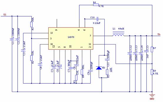 L4970A芯片的輸出電壓設定為10.8V,其輸出電阻R7由下式確定:,其中R9=4.7K,令Uo=10.8V,則R7=5.25K,取標稱值5.1K。