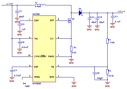 MAX668為固定頻率,電流反饋型PWM控制器,內部采用雙極型CMOS多輸入比較器,可同時處理輸出誤差信號、電流檢測信號和斜率補償信號,由于省去了傳統的誤差放大器,從而抑制了由誤差放大產生的相移。MAX668能夠驅動多種類型的N溝道MOSFET,這里選擇的是FDS6680。由于芯片工作在100 kHz 以上的高頻狀態,所以二極管D1應選取可高速關斷的肖基特二極管,本文選擇的是MBR5340T3。