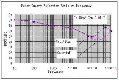 Power supply ripple rejection ratio (PSRR)是反應LDO輸出對輸入紋波抑制的一個交流參數,輸出和輸入的頻率是一樣的。和噪聲(Nosie)不同,噪聲一般為在10Hz至100kHz 頻率范圍內一定輸入電壓下其輸出噪聲電壓的均方值,PSRR的單位是dB。