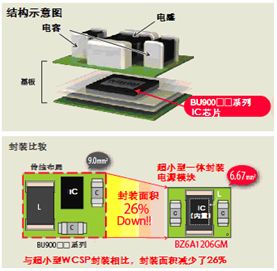 此次羅姆開(kāi)發(fā)的“BZ6A系列”將6MHz動(dòng)作的高速開(kāi)關(guān)電源IC“BU9000X系列”內(nèi)置于基板,同時(shí),將所需零部件封裝于一體。不僅保持了產(chǎn)品的高性能,而且實(shí)現(xiàn)了業(yè)內(nèi)最小尺寸的超小型電源模塊。由于不再需要外置零部件,因此,簡(jiǎn)化了開(kāi)關(guān)電源電路的設(shè)計(jì)的同時(shí)使超小型化、高密度封裝成為可能,為縮短各種設(shè)備的開(kāi)發(fā)周期做出了巨大貢獻(xiàn)。另外,輸入電壓范圍更寬,達(dá)2.3V~5.5V,因此,可用于具有USB 接口、5V輸出的移動(dòng)設(shè)備等。不僅如此,輸出電壓還可個(gè)別對(duì)應(yīng)1.0V~3.3V范圍的產(chǎn)品,不僅可用于移動(dòng)設(shè)備,還可用于其他各種產(chǎn)品中。