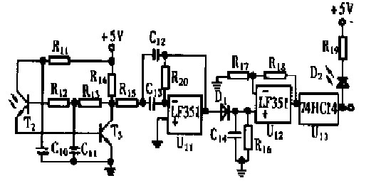 圖2 中的U11 組成二階帶通濾波器, 可以濾去151625kHz 以外的信號。該級增益為1 , Q 值為5 ,截止頻率、中心頻率以及濾波特性容易調整。二極管D1 和電容C14組成檢波電路,可以從151625kHz 信號上解調出包絡信號。上述兩部分電路可以濾除陽光、日光燈、白熾燈等干擾源的作用。
