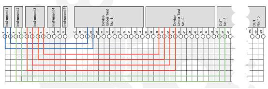 可以選擇另一種方式對矩陣進行配置,這種方式可以得到更為高效,并且Pickering公司的BRIC也非常適用在這種方式中。前面提到的矩陣構(gòu)成方式是,將測試裝置和Y向進行連接,將待測設(shè)備的接入點和X向進行連接,下面我們采用另一種方式重新對矩陣進行排列,將所有的測試裝置以及待測設(shè)備的接入點都和X軸向進行連接。而Y軸則是將X軸方向上的不同設(shè)備進行相互連接。盡管在許多應(yīng)用中,如果PXI的前面板上有需要的話,Y軸是可用的,但是Y軸的輸出并沒有用到。