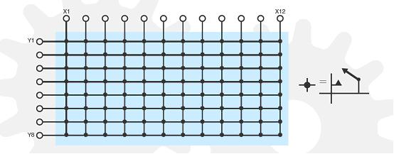 圖中是一個12*8的矩陣開關(guān)。這個矩陣開關(guān)是由96個繼電器將8條Y向線路和12條X向線路連接在一起的。在每個交叉點上都有一個繼電器,這個繼電器是將橫向X軸和縱向Y軸連接在一起,或?qū)烧叻珠_的。