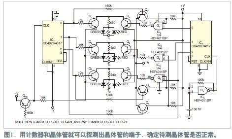 圖1中的簡單晶體管測試儀可以判斷出晶體管的類型,并且能幫助檢測出晶體管的發射極、集電極和基極。其方法是檢查被測晶體管三個端子T1、T2和T3之間流過的各種可能電流方向的組合。