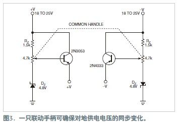 由于晶體管的基-集電極反偏擊穿電壓各不相同,因此電路提供了一種改變電源電壓的簡單方式(圖3)。隨著電壓的升高,與發射極連接的兩只LED都發光,而集電極只有一個LED發光(圖2中b和d)。±4V的基本電壓足夠用于檢測晶體管的基極或類型。如將電源電壓從±4V增至±15V,就可以測試很多種晶體管的發射極??紤]到串聯LED的壓降,這個范圍可為基射結提供最高26V以上的反向擊穿電壓。