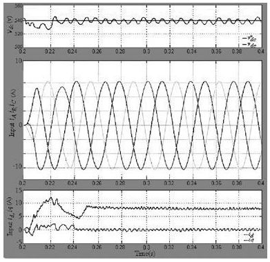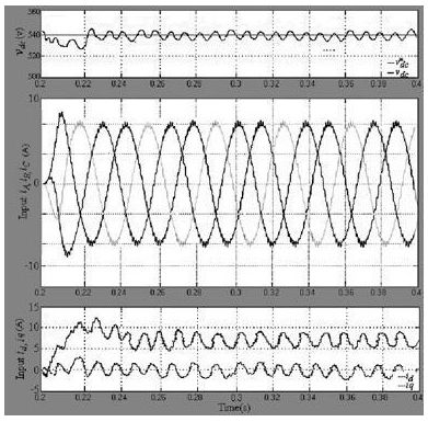 在正常工作條件下, 穩壓器輸出穩定的直流母線電壓和d 軸電流控制, 但是逆變器負荷不均衡, 就會產生波動的直流電壓, 因此整流器在不平衡負載下會造成前端總諧波失真( THD) 的輸入電流。