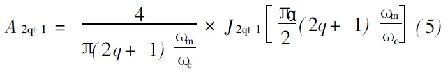 式中, q= 0, 1, 2, ……∝;ω m 是調制頻率; ωc 是載波頻率; ωm ≤ωc , a是調制指數; J v ( z) 是第一類Bessel 函數。公式( 5) 只適用于頻率范圍遠遠低于載波頻率, 此時在一次波段的載波頻率可以忽略不計。在本文的系統研究中, m / c= 1/ 90 適用于規定計算, 并假設調制指數: