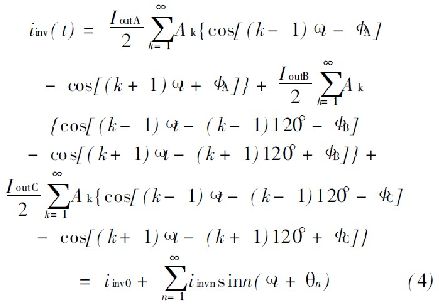 式中, I inv0是直流分量的逆變器輸入電流; I invn 是n 階部分的電流。通過公式( 4) 可看到, I outA = I outB = I outC和ΦA= ΦB= ΦC , 同時有I invn = 0, 如果n> 0 三相負載電流是平衡的。否則, 交流成分存在會造成連鎖反應。