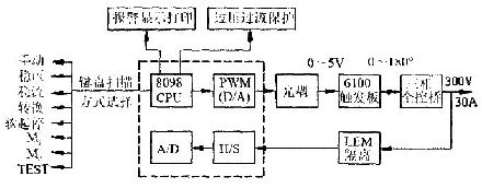 系統工作在開環狀態,利用8098的PWM口,經濾波后輸出一個0~5V的控制電壓信號給觸發板,使整流橋相應輸出電壓為0~300V.該方式主要用于系統主電路的檢修和維護。
