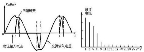 (a) 電網(wǎng)輸入端電流和電壓的畸變 (b)峰值電流中的各次諧波分量頻譜