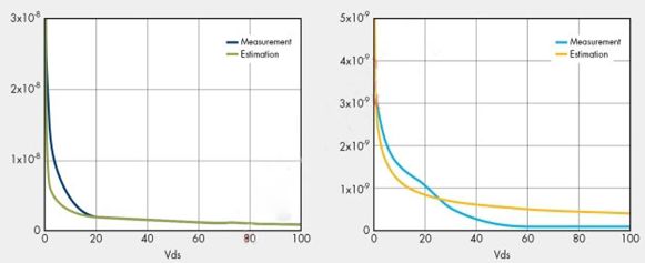 圖2(a)顯示了輸出電容的測量值及由公式(3)得出的擬合曲線。然而,對于具有更多非線性特性的新式超級結MOSFET而言,則簡單的指數曲線擬合有時不夠好。圖2(b)顯示了最新技術MOSFET的輸出電容測量值及用公式(3)得出的擬合曲線。兩者在高壓區的差距將導致等效輸出電容的巨大差異,因為在積分公式中電壓與電容是相乘的。圖2(b)中的估計將得出大得多的等效電容,這會誤導轉換器的初始設計。