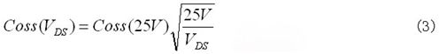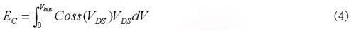 如果依據漏源電壓變化的輸出電容值可得,則輸出電容儲能可用公式(4)求出。雖然電容曲線顯示在數據表中,但要想從圖表中精確讀出電容值并不容易。因此,依據漏源電壓變化的輸出電容儲能將由最新功率MOSFET數據表中的圖表給出。通過圖3顯示的曲線,使用公式(5)可以得到期望的直流總線電壓下的等效輸出電容。