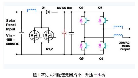 升壓+H-橋拓?fù)涫翘?yáng)能逆變器極為常用的拓?fù)渲唬且环N兩級(jí)非隔離拓?fù)洹F涞谝患?jí)是升壓級(jí),用于把模塊的可變輸出電壓(例如100V – 500V)升高到更大的中間電壓,后者必須大于實(shí)際峰值主線電壓(如230V x sqrt(2),或>325V)。該升壓級(jí)還有一個(gè)重要作用,就是為了實(shí)現(xiàn)效率最大化,太陽(yáng)能模塊必須運(yùn)作產(chǎn)生盡可能大的功率,而太陽(yáng)能模塊的功率 曲線可通過(guò)輸出電流乘以輸出電壓數(shù)值獲得。功率特性中有一個(gè)最大點(diǎn),被稱為“最大功率點(diǎn)”或MPP,而這精確位置會(huì)隨著模塊的類型、溫度和日照陰影等因素而變化。