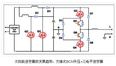 有很多方法能夠提高升壓逆變器的效率。由于升壓逆變器可在連續(xù)傳導(dǎo)模式或邊界傳導(dǎo)模式(CCM 或 BCM)下工作,這就衍生出不同的優(yōu)化方案。在CCM模式中,損耗的一大主因是升壓二極管的反向恢復(fù)電流;在這種情況下,一般使用碳化硅二極管或飛兆半導(dǎo)體的Stealth 二極管來(lái)解決。太陽(yáng)能逆變器更常采用的是BCM模式,而盡管對(duì)這類功率級(jí)通常建議選擇CCM模式,但采用BCM模式的原因在于BCM模式中二極管的正向電 壓要低得多。而且,BCM模式也具有高得多的EMI濾波器和升壓電感紋波電流。這時(shí),良好的高頻電感設(shè)計(jì)是一解決方案。