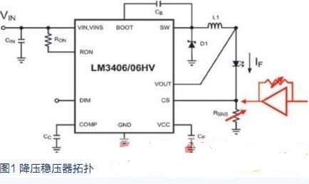圖1顯示采用降壓拓撲的一個 LED驅(qū)動器。Vin必須始終高于LED 和RSNS上的電壓之和。電感電流為LED電流。該電流通過監(jiān)控CS引腳的電壓進行調(diào)節(jié)。當(dāng)CS開始低于設(shè)置的電壓時,流經(jīng) L1、LED和RSNS的電流脈沖的占空比增加,從而增加LED的平均電流。