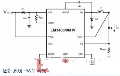 雙線PWM調(diào)光是用于汽車內(nèi)部照明的常見方法。當(dāng)VIN被調(diào)制為低于 VIN-NOMINAL的 70% 時,VINS引腳(圖2)檢測電壓的變化,并將PWM波形轉(zhuǎn)換為和輸出驅(qū)動電路相應(yīng)的PWM。這種方法的缺點是轉(zhuǎn)換器的電源必須包含一個電路,以便為其直流輸出提供 PWM 波形。