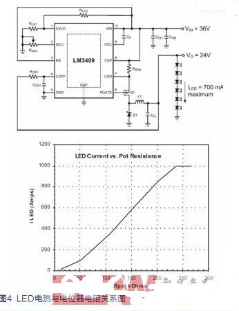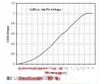 圖4顯示了測得的LED電流與IADJ引腳和Gnd之間的電位器電阻的關(guān)系圖。1Amp處的平頂表示最大額定LED電流,該值由圖4中所示的電流檢測電阻 RSNS設(shè)置。