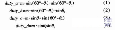 以虛擬整流器、逆變器均工作在第一扇區為例,相量合成的固定空間電流、電壓相量分別是I6、I1和U6、U1,兩個空間相量的綜合調制采用相互嵌套的辦法來實現。整個輸入相電流和輸出相電壓相量合成共有I6-U6、I6-U1、I1-U6、I1-U1、I0-U0 5種組合。每一相量組合的作用時間用占空比duty來表示。等式(1~5)反映了占空比的計算公式。占空比可以通過表1來分配給相應的開關組合。