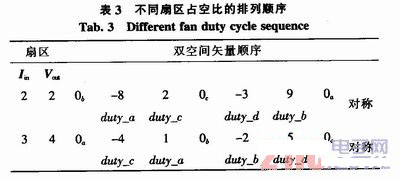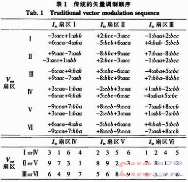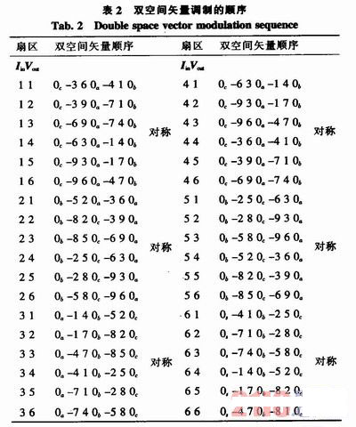 空間矢量調制法只確定開關間隔中應用電壓矢量的占空比,從而獲得低頻率的輸出電壓和輸入電流的平均值,但是并沒有確定使用的順序。所以需要使用雙空間矢量調制法,同時也可改善波形的質量。圖2表明了輸入電流在4扇區,輸出電壓在5扇區應用雙空間矢量調制的順序。電壓矢量在開關間隔中對稱分布,零矢量每4個開關間隔使用一次。在每次開關轉換中只有一個開關狀態發生改變以最大程度地降低損耗。在圖2中通過表格2確定相應開關時間:
