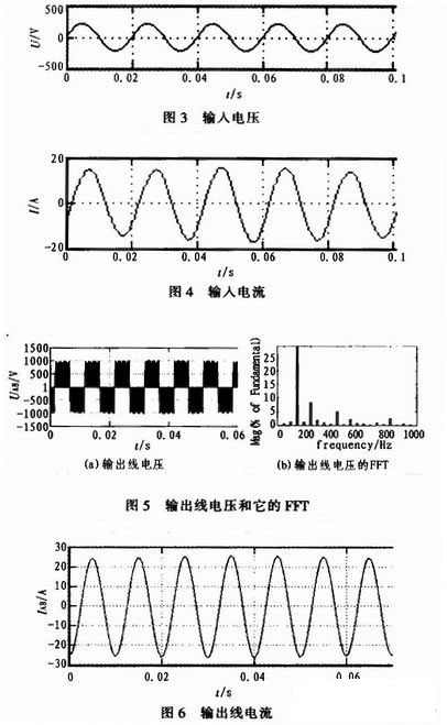 設定的輸出頻率為100 Hz,電壓調制比為0.75,仿真算法為ode15s,仿真時間為0.4s,濾波參數為L=100mH,C=70μF,負載為星形連接感性RL負載,采用輸入功率因素為1的控制策略,輸入相電壓和相電流基本同相位,仿真結果表明矩陣變換器的輸出電壓是一個正弦性很好的PWM波形,諧波分量比較小,輸出線電流的正弦性較好,驗證了控制策略的正確性,以下為各仿真波形。