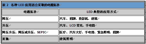 如同表2所示,LED已廣泛運用于各領域,因此需要許多種類的電源拓撲,支持LED的應用。一般而言,必須考慮輸入電壓、輸出電壓及對隔離的需求,以做出適當選擇。