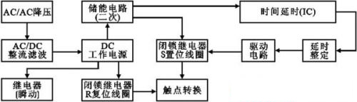 斷電延時繼電器整體構成包括斷電延時繼電器電源部分(經(jīng)降壓、整流、濾波)以提供斷電延時繼電器內(nèi)置瞬動電磁繼電器和2繞組閉鎖型R復位線圈工作);二次電源部分(供斷電后延時部分與2繞組閉鎖型S置位線圈工作);延時工作部分(可編程定時集成或CMOS計數(shù)分頻集成);驅(qū)動部分;執(zhí)行繼電器部分組成(圖1)。