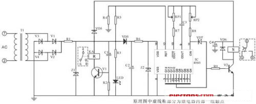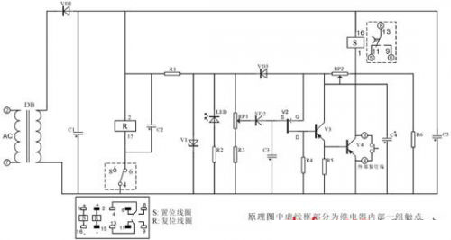 該電路核心部分由IC4541構成,延時設定由RP2、C*設定,A-B端根據(jù)需求接相應高、低電平(設定端)內(nèi)部2繞組閉鎖繼電器采用DC12V(因繼電器工作電壓與IC4060組成延時電器要低,則為保證其驅(qū)動則分別由V6、V7、V1、V3構成)。其中C2為二次儲能器件,可根據(jù)延時的長短予以調(diào)整,C4為完成S置位線圈工作。