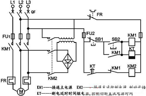 制動過程:按下停止按鈕SB1→KM1斷電,KM1主觸點斷開,電機脫離電源,KM1輔助常閉觸點恢復閉合,KM2通電,接入直流電源,制動開始,同時KM1輔助常開觸點又恢復斷開,則KT線圈呈斷電狀態(tài),延時開始,待所設延時時間到達后,KT的延時斷開常開觸點恢復斷開,KM2失電,切斷直流電源,制動結(jié)束。