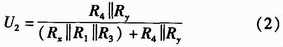 如圖2所示,U+和U-為被測線路的母線供電電壓,正常工作時兩母線間的電壓差Ux+y為440 V,且隨蓄電池內阻變化。Rx,Ry分別為被測線路的正母線絕緣電阻和負母線絕緣電阻。正、負母線絕緣電阻反映的是64路的正、負支路的總體絕緣性能,等效于各個支路的正、負絕緣電阻的并聯,正常時兩母線絕緣電阻>20 kΩ。Ux和Uy為正負母線對地電壓,大小隨正負母線的絕緣電阻變化,但兩母線電壓差恒定為Ux+y。為了檢測正負母線電壓Ux,Uy,Rx,Ry,系統采用了“平衡-不平衡檢測法”檢測母線電壓和母線絕緣電阻。計算公式如式(1)所示。