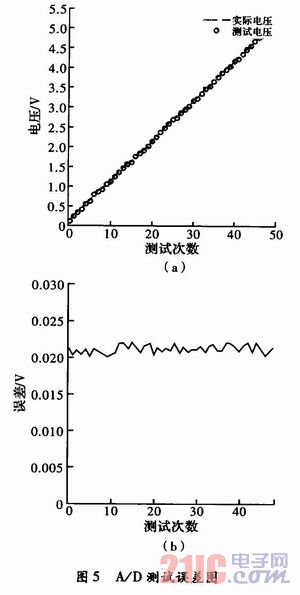 為了達到好的測試效果,A/D采集必須達到一定的測試精度,圖5是A/D采集的實測數據和測試誤差分析曲線,從圖中可以看出,A/D采集的誤差約20 mV,屬于正常范圍,因為系統采用8位A/D,5 V基準電壓。這個采樣精度滿足整體的設計要求。