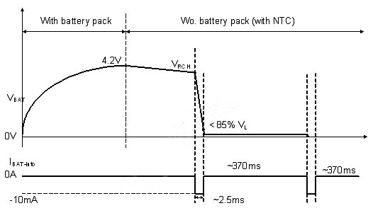 使用者亦有可能在充電或式充電完畢后,在未將電源移除的情況下,即抽離電池的情況。為避免造成危險,IC內(nèi)部應(yīng)具有如圖7, 8的電池存在偵測機(jī)制。充電IC會以短時間脈沖(每370ms產(chǎn)生2ms的脈沖)方式抽取電池電流,此時若電池存在,則偵測到的電池電壓應(yīng)大于一預(yù)設(shè)閥值;若電池已切離,則充電IC偵測到一低電壓,即可判定為電池?cái)嚅_狀態(tài),并將電池端電壓切斷,保護(hù)使用者安全。