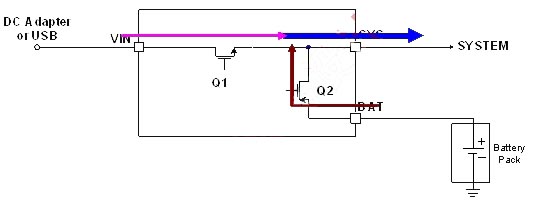 LD6275具有適應(yīng)性電源路徑管理(Adaptable Power Path Management, APPM)功能,其為以供給系統(tǒng)端用電為主,對電池充電為輔,如圖3所示;當(dāng)系統(tǒng)用電超過輸入電源的供給限制時,其電池亦能主動開啟放電功能同時對系統(tǒng)端供給其所需之電能需求,如圖4所示。