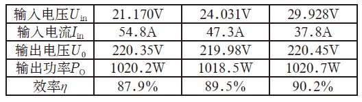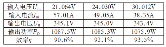 由兩路單端反激并聯組成的逆變電源前級DC/DC電路(見圖5),輸出功率約1.1kW,試驗結果如表1所示。