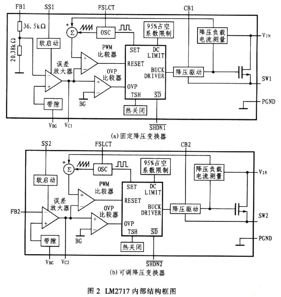 LM2717是美國國家半導體公司推出的一款全新的高性能DC/DC變換器,內含2個降壓脈寬調制(PWM)直流/直流變換器,其中一個專門用來提供固定輸出3.3 V電壓,另一個專門用來提供可調輸出電壓。2個變換器都設有導通電阻(RDSON)只有0.16 Ω的內部開關,確保轉換效率最高,工作頻率可以在300 kHz~600 kHz調節,系統可以采用較小巧的外部元件。每個變換器也可以用其關閉引腳單獨關閉。該電路可廣泛應用于薄膜晶體管液晶顯示器(TFT-LCD)、測控裝置、便攜式產品和膝上電腦。