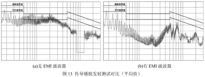 圖 13 是電源端子騷擾電壓的對比測試圖,圖(a)是未加 EMI 濾波器測試的,圖(b)是同一臺 IGBT 逆變焊機(jī)加裝 EMI 濾波器后測試的,無 EMI 濾波器時在低頻、中頻段均超標(biāo),加上 EMI 濾波器后,低頻、中頻段傳導(dǎo)騷擾顯著降低,但在 5~8MHz 頻段出現(xiàn)諧振(不超標(biāo)) ,測試結(jié)果符合 GB15579.10-2008 的要求。