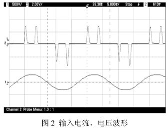 圖 2 是 IGBT 逆變焊機(jī)的輸入相電流、電壓波形。由圖 2 可見,輸入電流已不再是正弦波,而是一種前后沿都比較陡峭的脈沖,由整流、濾波引起的電流波形畸變是 IGBT 逆變焊機(jī)的共性問題。畸變的電流、電壓高次諧波會沿電源電纜、供電網(wǎng)絡(luò)產(chǎn)生傳導(dǎo)騷擾和輻射騷擾,由于頻率相對較低,其輻射水平并不會很高。
